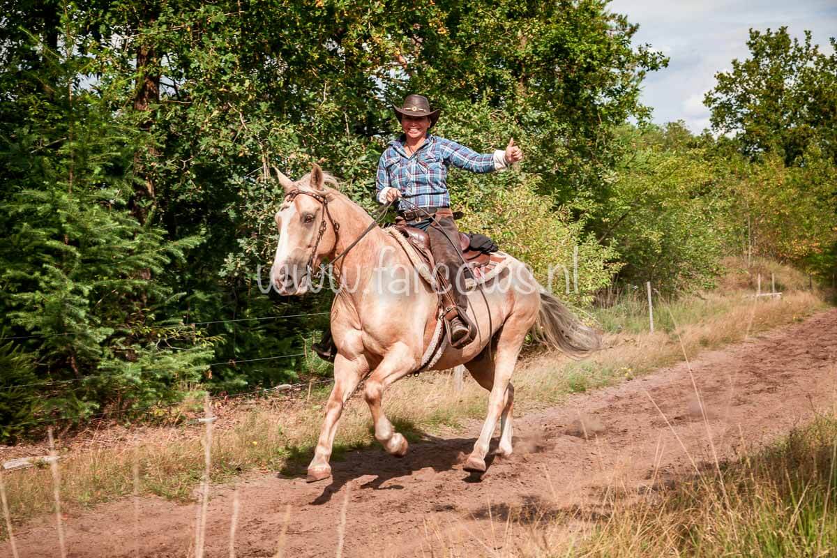 Vanaf de heuvel kunnen wij een beetje de bocht inkijken. Het bordje met mijn logo staat nog iets verder, maar het is goed te zien dat zo simpel iets wel werkt. Ruiters stoppen, spreken af wat ze gaan doen en komen dan voorbereid op het fotomoment het rechte pad op. Naast elkaar, achter elkaar, stap, draf of galop, het wordt allemaal gefotografeerd. Men herkent mij, ik herken anderen, het is een heerlijke sfeer. Als de dag op het einde loopt, worden de spullen ingepakt en op de trolley geladen. Als ik ‘m van z’n plek af trek, voelt het minder soepel als normaal.