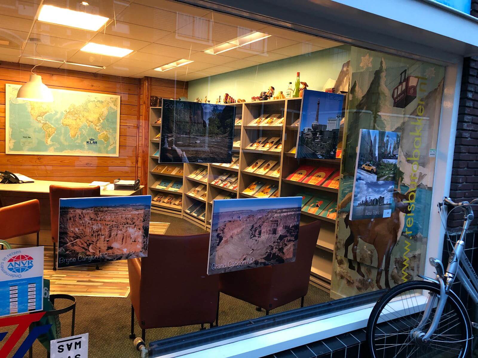 Het was de bedoeling om een stuk of tien foto’s af te laten drukken op canvas, maar ik geloof dat wij al meer dan 20 foto’s verzameld hadden. Mijn broer had een paar maanden terug een mooie foto in Yellowstone gemaakt en die mocht ook gebruikt worden. Samen met een aantal foto’s van het reisbureau zelf, bleef er te veel keuze over. Aangezien er met drie grote raampartijen geen gebrek aan ruimte in de etalage is, werd er besloten om hiervan gebruik te maken.